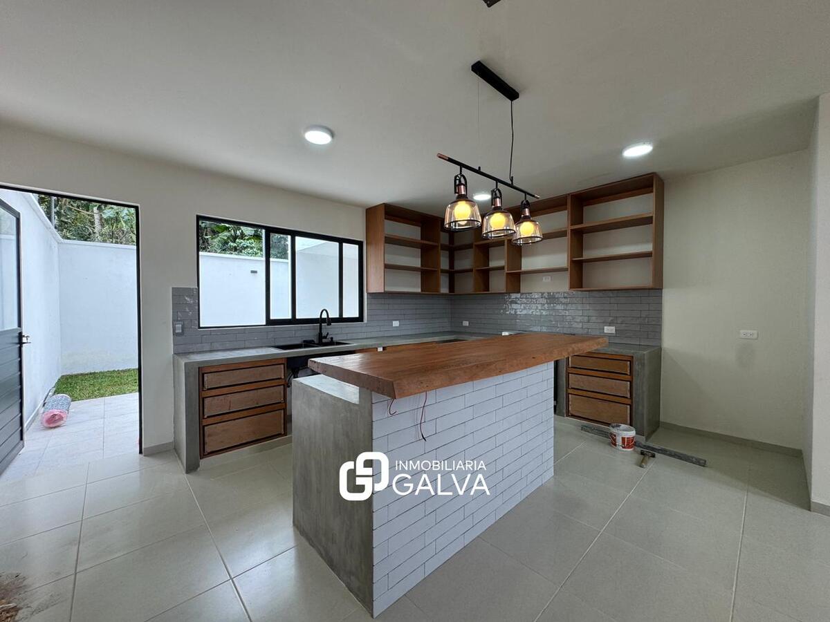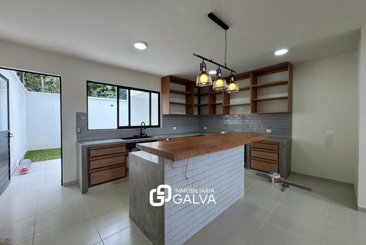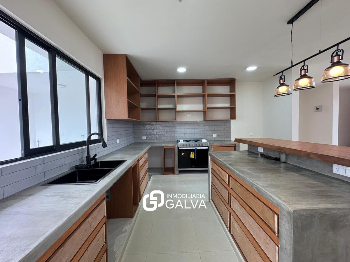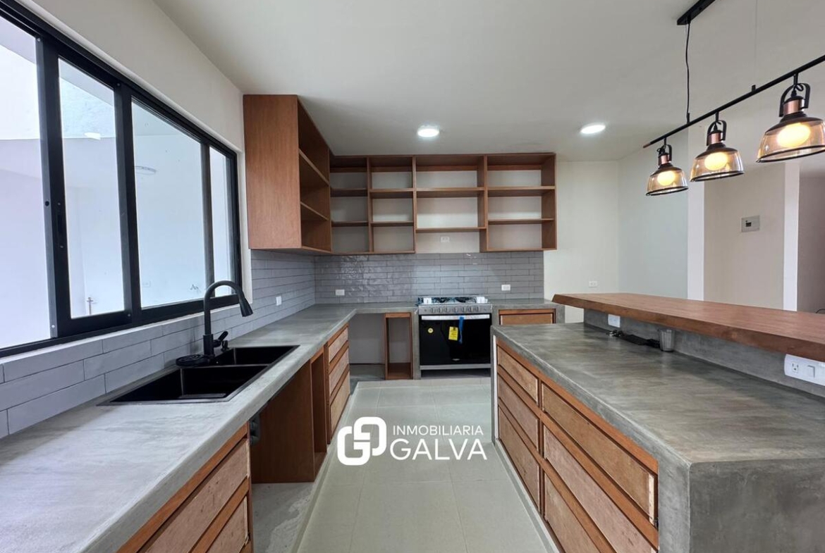 Cocina con barra y mobiliario de madera de pino, tarja de acero inoxidable y estufa